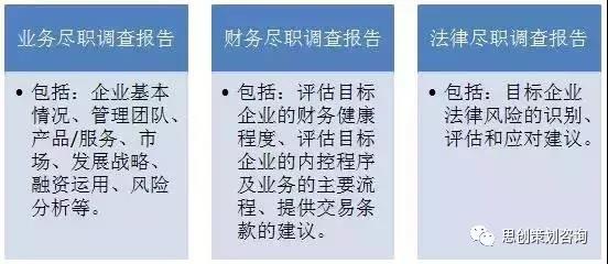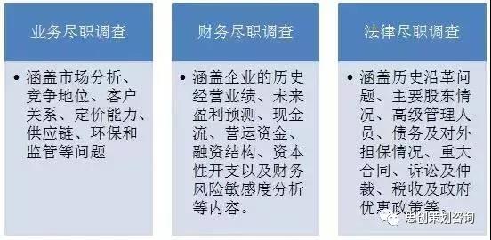 尽职调查主要可以分为业务尽职调查、财务尽职调查和法律尽职调查大三部分。